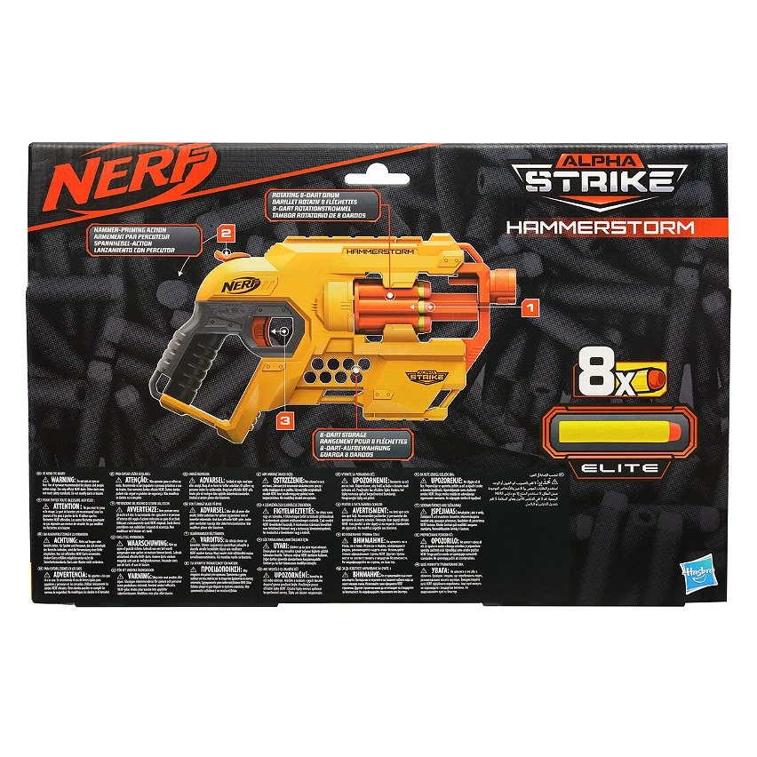 Les fans seront prêts à l'action grâce aux blasters Alpha Strike de Nerf, la marque N°1 des blasters !* Le blaster Alpha Strike Hammerstorm permet de frapper fort dans la compétition. Le blaster s'amorce avec le percuteur : il suffit de ramener le percuteur vers l'arrière et d'appuyer sur la détente pour tirer une fléchette. Le barillet rotatif a une capacité de 8 fléchettes, ce qui permet d'effectuer plusieurs tirs avant de recharger. Il est vendu avec 8 fléchettes Nerf Elite officielles. Les blasters Alpha Strike sont parfaits pour tous ceux qui veulent découvrir la compétition Nerf et constater toute la puissance et la performance de la marque Nerf. Ils sont faciles à utiliser pour commencer à jouer rapidement. Et pour les fans de Nerf, ces blasters sont d'excellentes additions à toute collection Nerf. Lunettes recommandées (non incluses). Aucune pile requise. *Source : NPD POS 2019 Blasters/jouets de tir et accessoires, G11 (USA, AUS, CAN, FRA, DEU, MEX, BRA, RUS, ESP, GBR, ITA) Nerf et toutes les marques associées sont des marques de commerce de Hasbro.