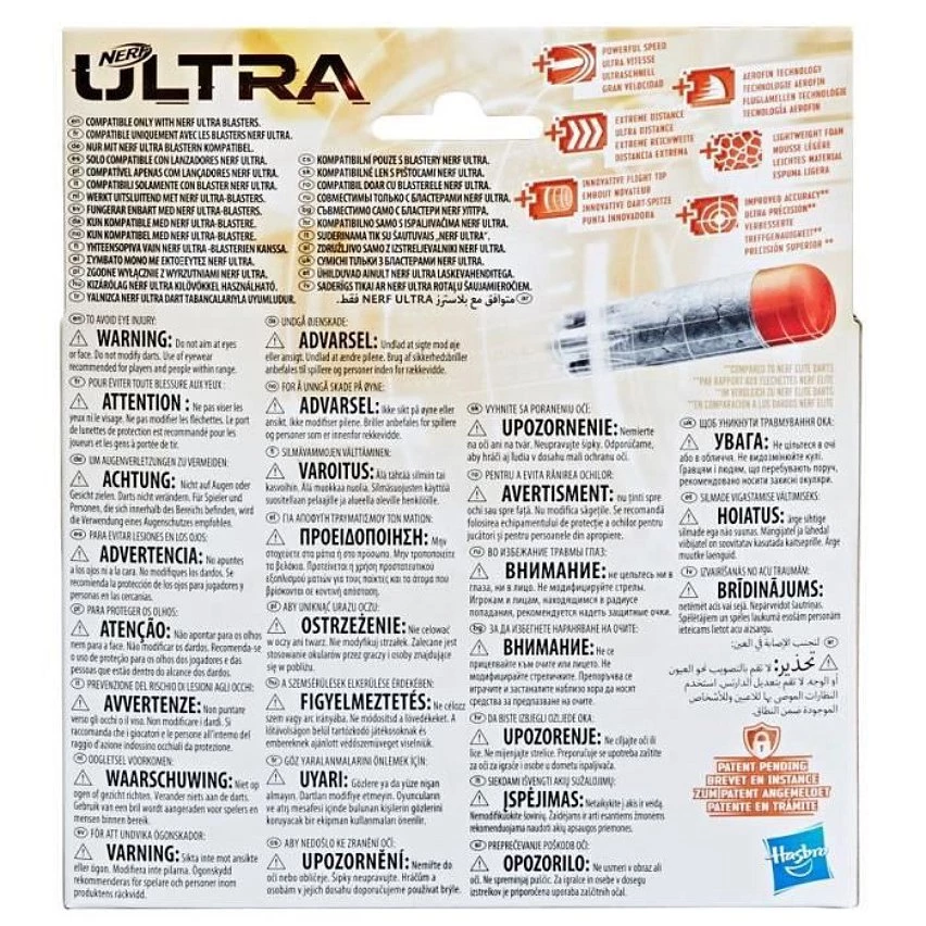 On peut se faire des réserves grâce à cette recharge de 20 fléchettes Nerf Ultra. Les fléchettes Nerf Ultra sont le nec plus ultra en tir de fléchettes Nerf ! De conception innovante, les fléchettes Nerf Ultra possèdent un embout novateur, la technologie Aerofin et sont faites en mousse Nerf Ultra. Cette recharge permet d'avoir des fléchettes sous la main pour recharger son blaster rapidement et passer moins de temps à ramasser des fléchettes par terre lors des compétitions Nerf. Les fléchettes Nerf Ultra ne fonctionnent qu'avec les blasters Nerf Ultra. Les blasters et les fléchettes Nerf Ultra représentent le nec plus ultra de Nerf : leur conception révolutionnaire procure un rendement exceptionnel en matière de distance, de précision et de vitesse. Les compétitions Nerf viennent de passer à un autre niveau grâce aux blasters et aux fléchettes Nerf Ultra ! (Les blasters sont vendus séparément.) Lunettes recommandées, non incluses. Nerf et toutes les marques associées sont des marques de commerce de Hasbro.